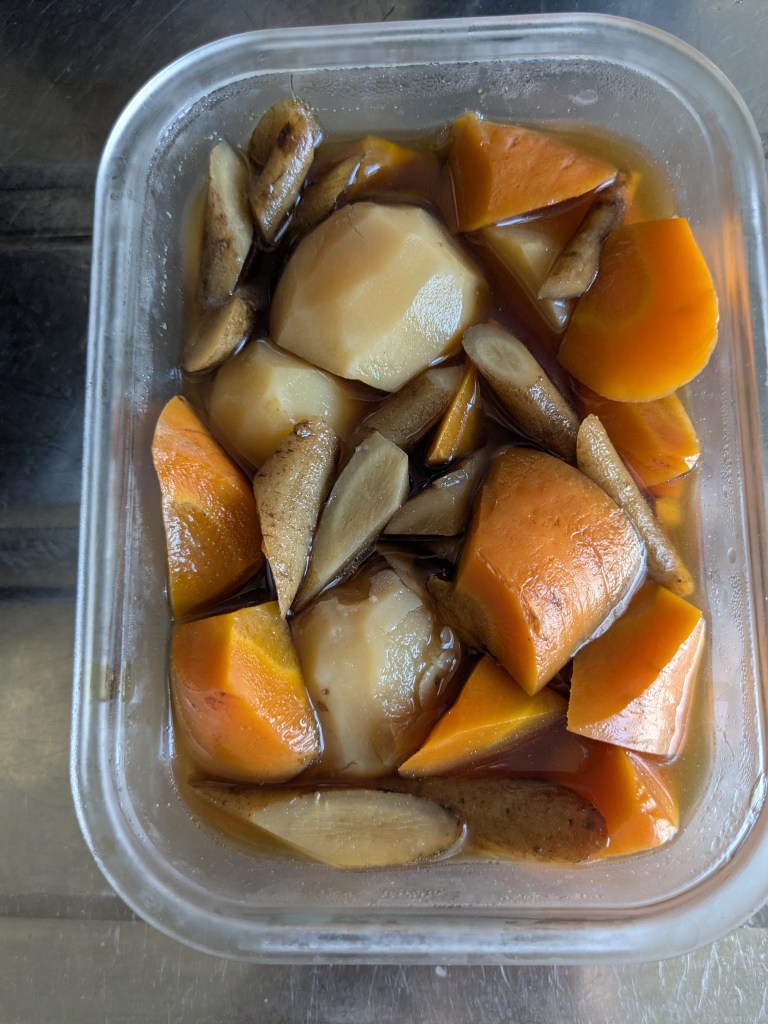 野菜を摂りたい、、と思い、台所を見廻すと、そこにあるのは牛蒡、人参、じゃがいも、玉ねぎ、こりゃ肉じゃがだなと思ったものの肉ほないので、シンプルに煮物を作りました。